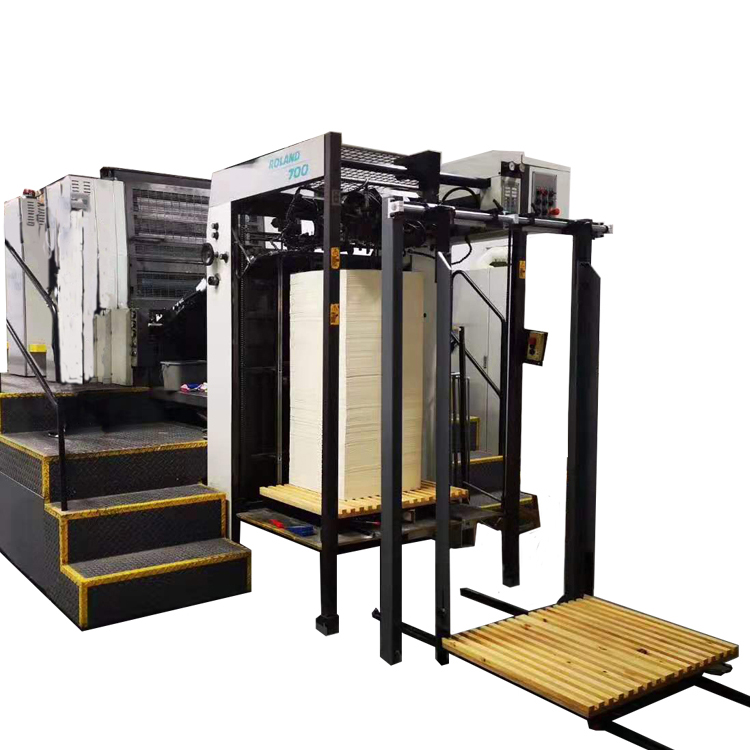 本公司開發生產了一種印刷機預裝紙裝置,適用于國內外各品牌印刷機,用于印刷機進紙的可垂直升降的進紙托盤,其特征在于: 在印刷機進紙托盤上安裝導軌,進紙托盤上導軌與地面安裝的導軌對接,所述導軌和所述進紙托盤之間還設置一個垂直于所述進紙托盤的縱長的定位尺。新型的印刷機預裝紙裝置通過導軌可以精確定位小平板車,再通過定位尺對其上的紙張進行定位,從而快速準確地對小平板車上的紙張進行定位作業。本實用新型的印刷機預裝紙置具有結構簡單,高效,定位準確等優點。